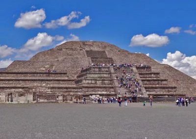 Posteriormente serán conducidos por 1 hora a Teotihuacan, arribando a las instalaciones de un centro artesanal en donde será ofrecida una explicación de los usos del maguey, además de contar con áreas para compra de artesanías elaboradas en la región para comprar si gustan algún souvenir, hacer uso de las instalaciones sanitarias o tomar una bebida refrescante. Inmediatamente serán trasladados al interior de la zona arqueológica de Teotihuacan, donde tendrán una explicación de las pirámides de la Luna, con su plaza y los templos de “Quetzal-papalotl” (pájaro-mariposa) y el de los caracoles emplumados.